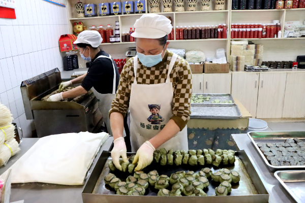 自进入销售旺季以来,该店铺日均制作香藤粑两百多斤,店里全员开足马力、加紧制作,全力保障市场供应。