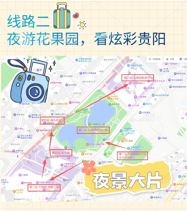 花果园国际文化艺术交流中心→花果园湿地公园→海豚广场→双子塔→嗨乐街区→花果园购物中心