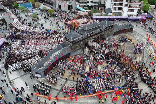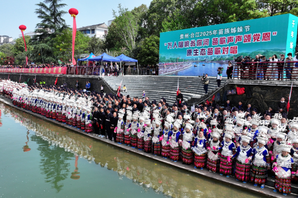 2025年台江苗族姊妹节万人唱响翁你河活动现场(无人机照片)。(邰光政 摄)
