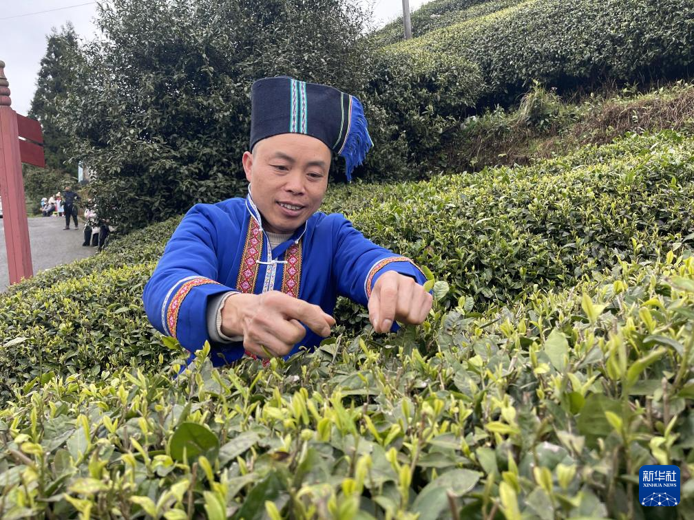 村民罗科平在螺蛳壳茶山采摘明前茶。新华社发