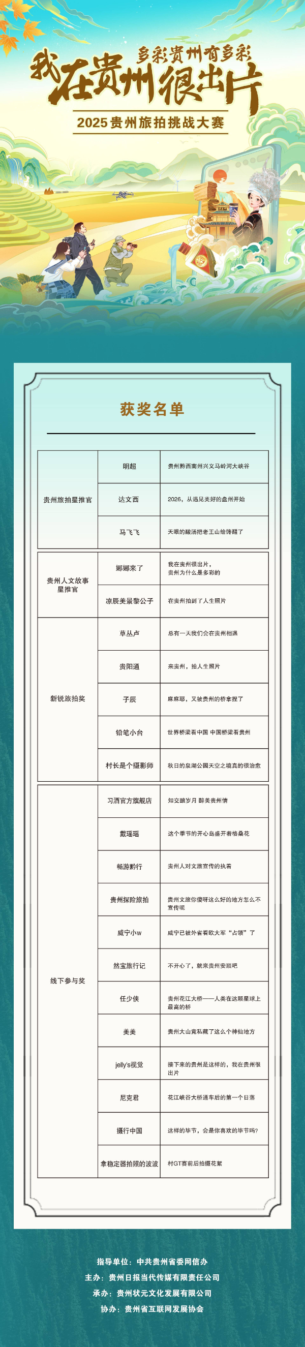 活动负责人在发言中表示,本次大赛充分激活新媒体传播力量,以大众创作讲好贵州故事,有效提升贵州文旅知名度与影响力。未来将持续打造“我在贵州很出片”特色传播平台,鼓励更多人用镜头记录贵州、宣传贵州,让这一品牌成为贵州文旅响亮名片。