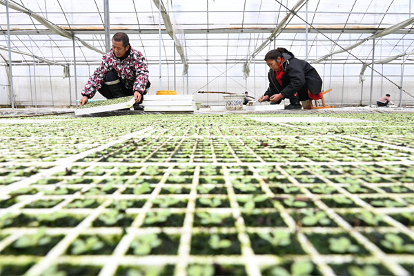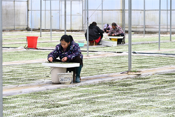 岑巩县天马镇白岩坪村烤烟育苗基地,村民在管护幼苗。(钟璐摄)