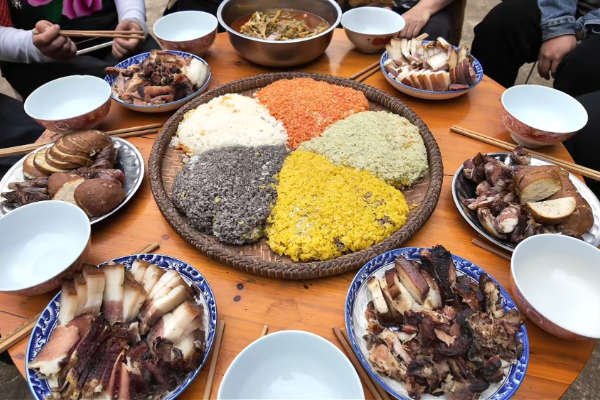五色糯米饭与苗家美味组成春日美食盛宴。