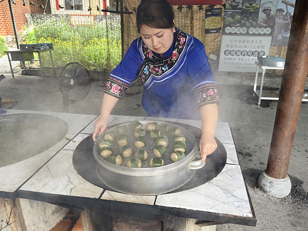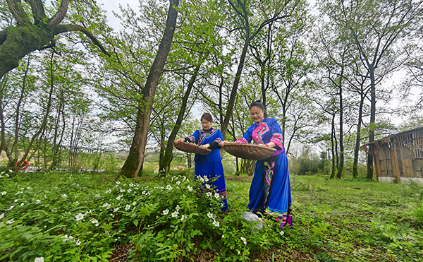 清晨的松江河畔,柳枝吐绿。杨显慧带着几位身着苗族服饰的妇女,俯身采摘沾露的鲜嫩艾草与蒿菜。远处青山含黛,勾勒出春日田园诗画。