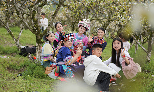 在黑水镇“桃梨欢喜”农业示范园,1500亩梨花迎来盛花期,漫山遍野的梨花如云似雪、清雅动人。微风轻拂,花瓣随风飘落,清甜的花香弥漫山野,勾勒出乌江岸边独有的春日田园景致。不少游客身着汉服、土家特色服饰漫步花海,用镜头定格美好春光;一家人围坐在梨树下闲谈野餐,孩子们在花间追逐嬉闹,欢声笑语洒满山谷。“特意从重庆酉阳自驾过来,路程方便,这里的梨花成片盛开特别治愈,空气清新、氛围安逸,很适合春假短途出游。”游客杨进飞笑着说。