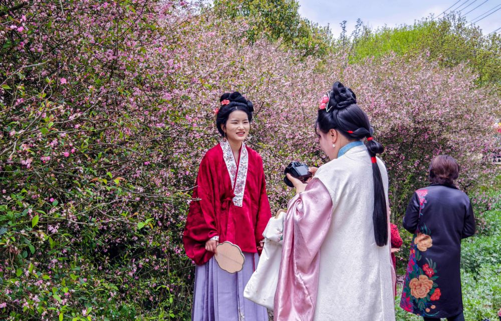 游客在清镇市红枫湖镇右二村樱花园打卡。余军 摄