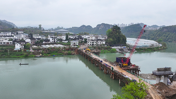 春风拂绿,锦江奔涌,机器的轰鸣声与江水拍岸交织成一曲奋进的乐章。走进贵州省铜仁市碧江区灯塔街道马岩村,一座临时钢栈桥如长虹卧波,桥一旁,钢管等建筑材料整齐堆放,另一旁,塔吊伸长臂架,白龙山1号桥的桥墩正节节拔高。这热火朝天的建设场景,正是铜仁市移民部门全力推进水库移民后期扶持项目建设的生动缩影。