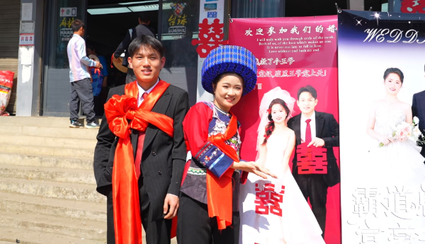 在简嘎乡磨上村的婚礼现场,新人黄金和龚金金在门口迎接前来祝贺的亲朋好友,他们说:“那天我父亲问我婚礼办一天行不行,我说可以,这样节约、方便,挺好的。”这场充满布依风情的简约婚礼热闹非凡,清脆悠扬的布依族唢呐穿山绕寨,喜庆的锣鼓声、鞭炮声此起彼伏,乡亲们围坐一堂、笑语盈盈,没有奢华排场,却满是真挚祝福。