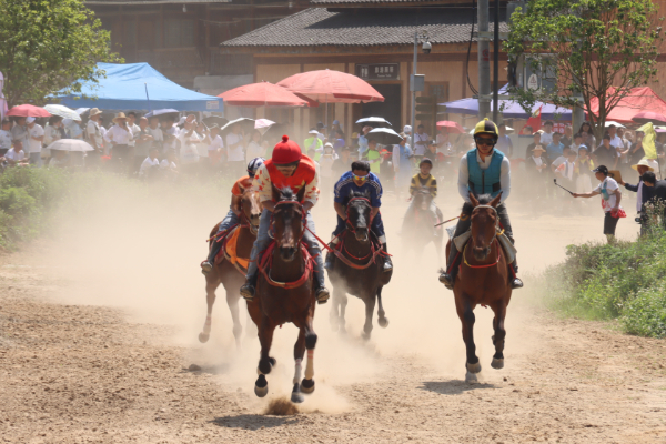 骏马飞驰、尘土飞扬,骑手们奋力驾驭马匹冲刺,赛道两侧游客云集,呐喊声、欢呼声此起彼伏,热闹非凡。马道两旁,身着水族盛装的村民唱响悦耳动听的水族歌谣,水族铜鼓舞、民族舞蹈韵味十足,将水族农耕文化与民俗风情融入舞姿,现场游客踊跃参与互动,真正实现全民参与、同乐共享,让赛事充满浓郁的民族气息。