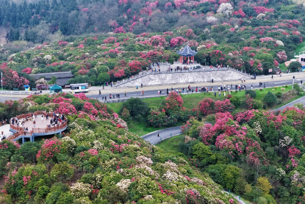 游客在贵州省毕节市百里杜鹃管理区普底景区赏花游玩。(陈鹤 摄)