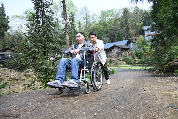 肖安金推着哥哥出门晒太阳。(杨豪 摄)