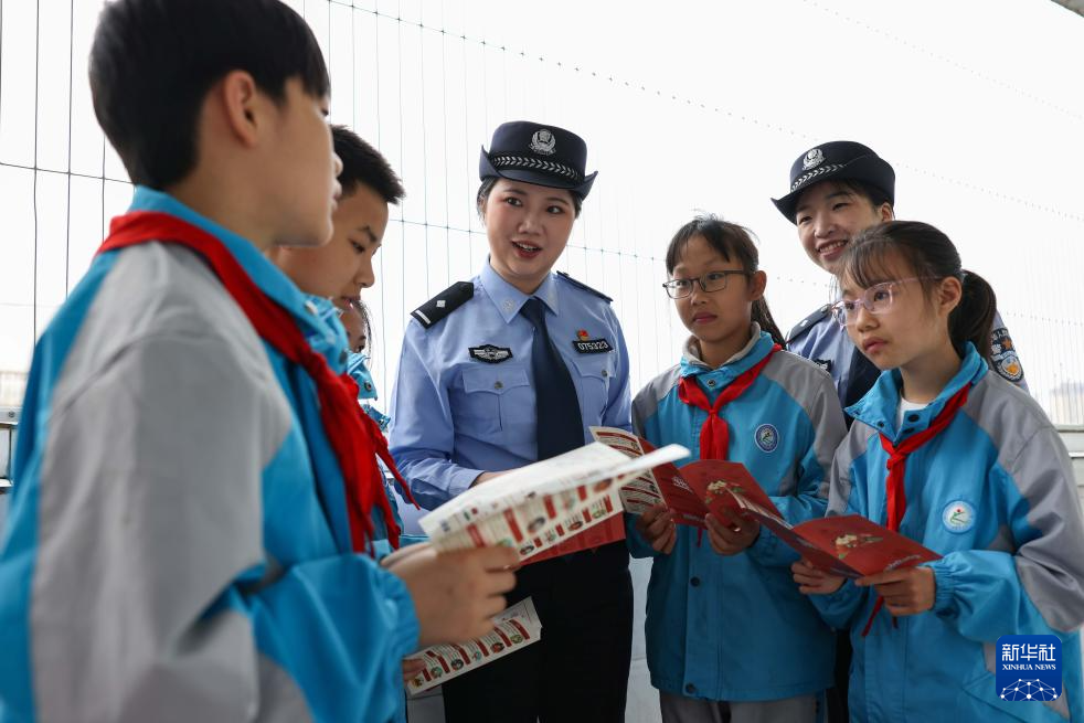 4月14日,在贵州省铜仁市玉屏侗族自治县第四小学,民警给学生讲解国家安全知识。新华社发(胡攀学摄)
