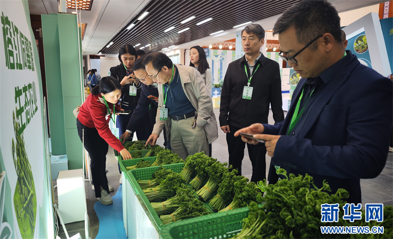 4月15日,与会嘉宾了解现场展示的山野菜。新华网 卢志佳 摄