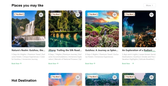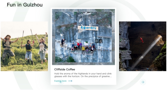 点击Guizhoutravel.com,你既可以通过全域旅游地图,将页面“摄像头”聚焦黄果树瀑布、小七孔、西江千户苗寨、赤水丹霞、万峰林、梵净山等各地美景;也可以在“趣玩贵州”探索悬崖咖啡、房车露营、漂流瀑降等特色玩法,手握醇香在悬崖举杯、徒步溯溪与山水同框……真正找到专属你的贵州故事;还可以在“月见贵州”发现云峰屯堡花朝节、加榜梯田开秧门等季节限定体验,不会错过贵州每一个月的精彩时刻。