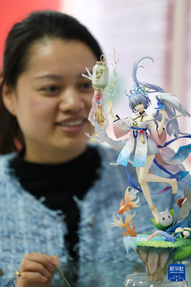 4月17日,一名女工在毕节高新技术产业开发区一家动漫手办生产企业内展示手办。新华社记者 刘续 摄