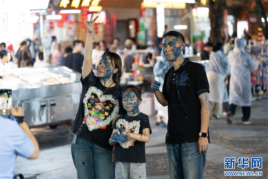 4月18日,在贵州省黎平县肇兴侗寨,参与“抹花脸”活动的游客在拍照。新华网发(龙建睿 摄)