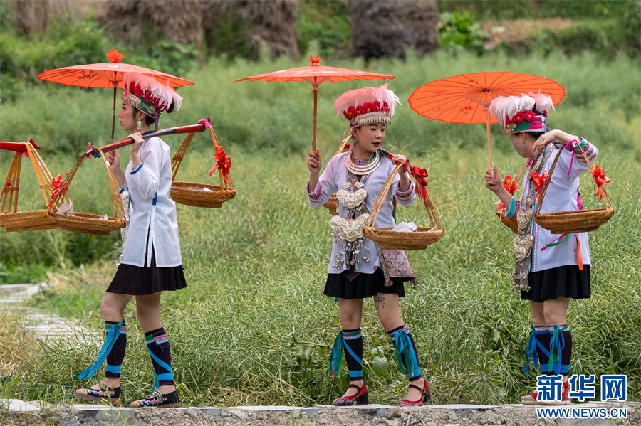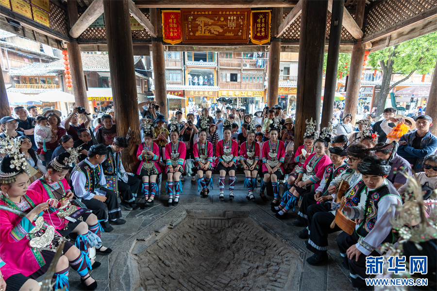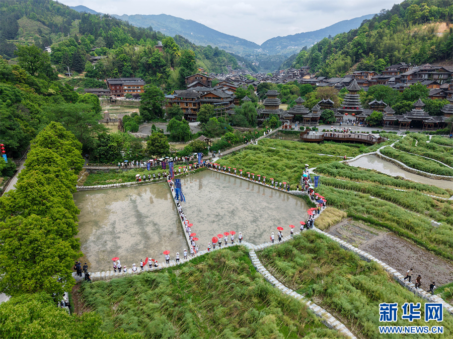 4月19日,在贵州省黎平县肇兴侗寨,当地群众身着民族服饰参加活动。新华网发(龙建睿 摄)