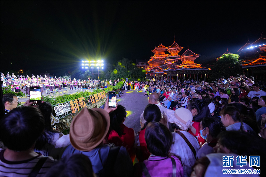 4月18日,游客在贵州省黎平县肇兴侗寨观看节目。新华网发(龙建睿 摄)