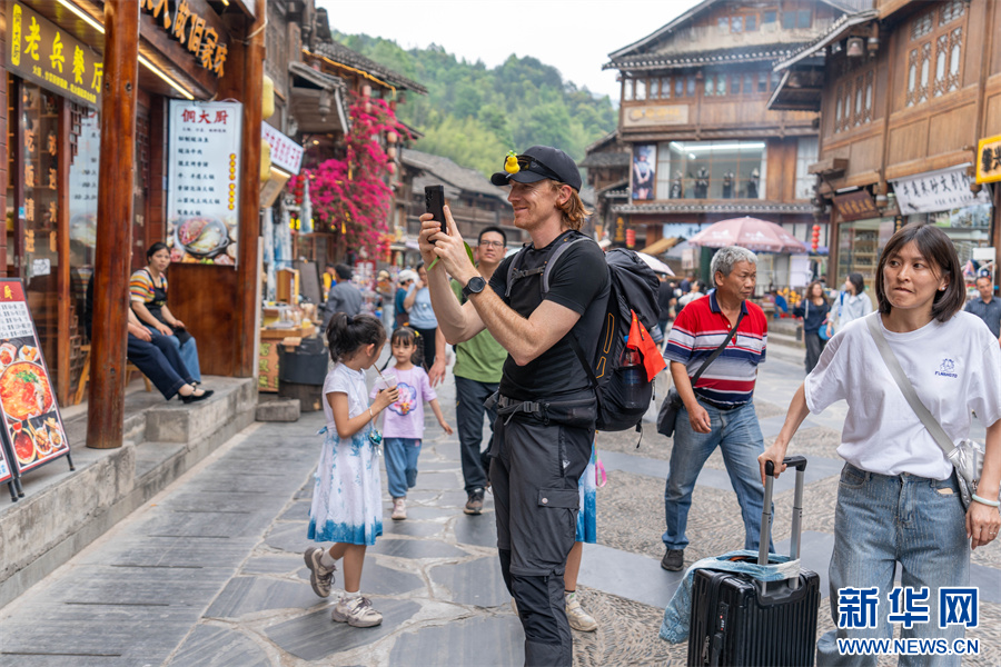 4月18日,游客在贵州省黎平县肇兴侗寨观光游玩。新华网发(龙建睿 摄)