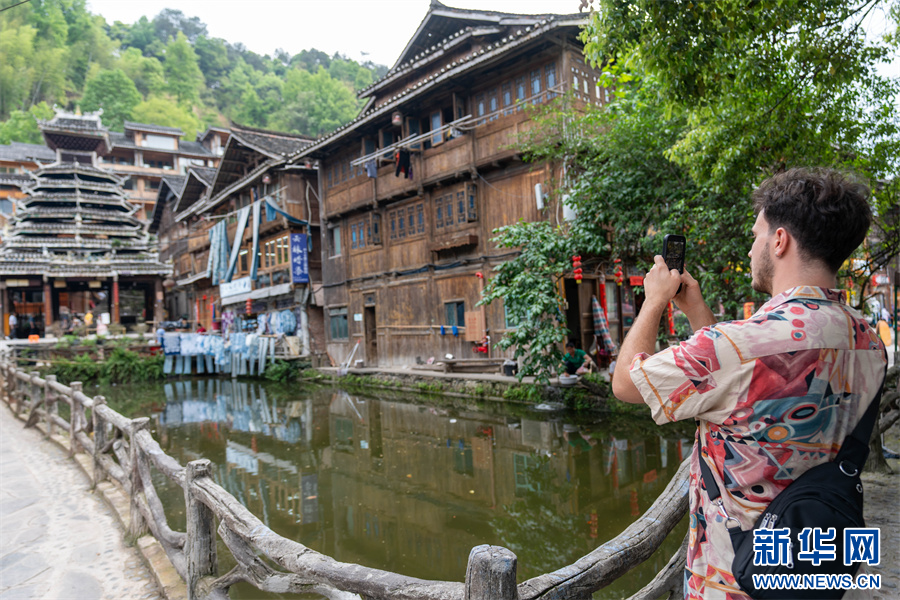 4月19日,游客在贵州省黎平县肇兴侗寨拍摄。新华网发(龙建睿 摄)