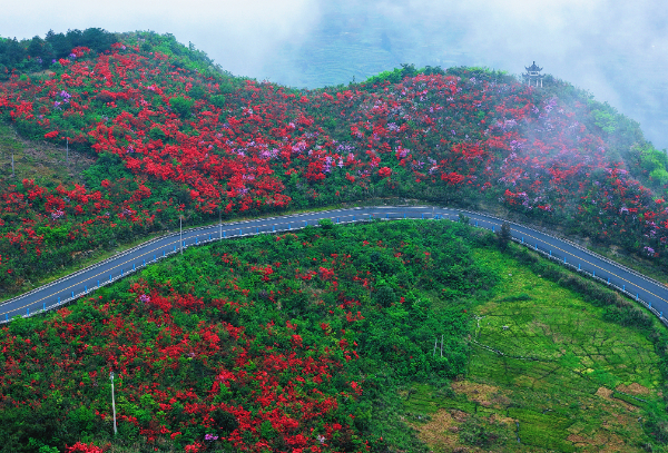 沿着蜿蜒的公路前行,清风裹挟着山野的清爽气息扑面而来,成片艳红的杜鹃花渐渐映入眼帘,宛如一张绵延不绝的红毯,铺展在苍翠山林间。置身这片烂漫花海,一步一景,风光旖旎,仿佛闯入唯美梦幻的童话秘境,令人沉醉其间,心生欢喜。