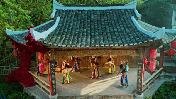 踏入屯门,一场国家级非物质文化遗产盛宴——屯堡地戏表演便拉开帷幕。演员们头戴色彩斑斓的木雕面具,手持刀枪,在铿锵的锣鼓声中腾挪跳跃,演绎着忠义故事,精彩的表演让东南亚文旅体验官们仿佛穿越六百年时光。