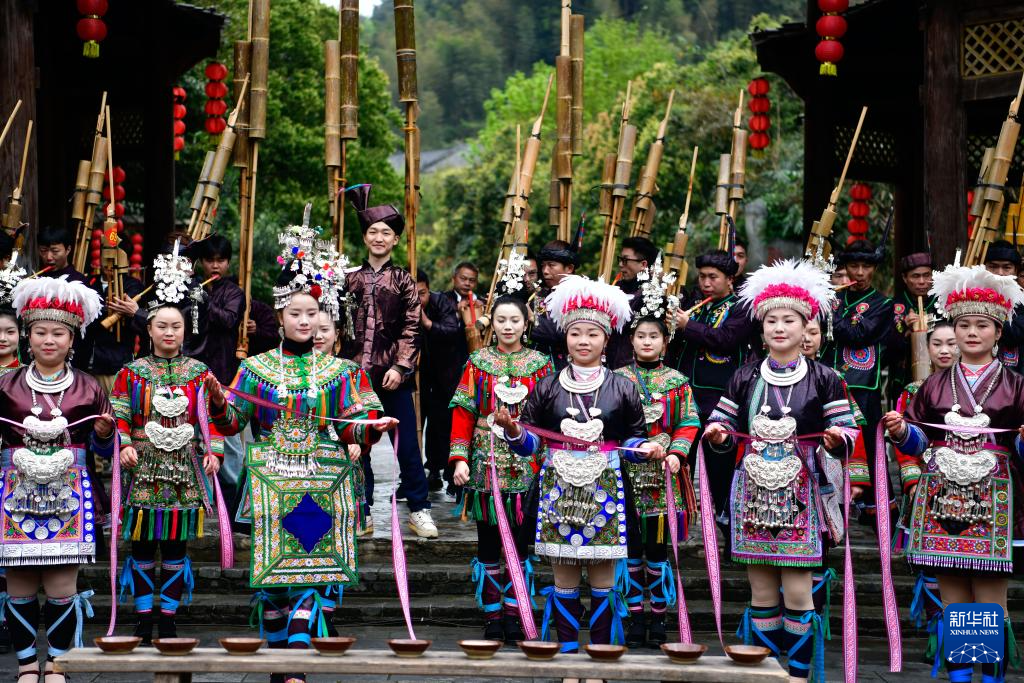 在贵州省黎平县肇兴侗寨,侗族姑娘们穿着银饰盛装迎宾(3月23日摄)。新华社记者 杨文斌 摄
