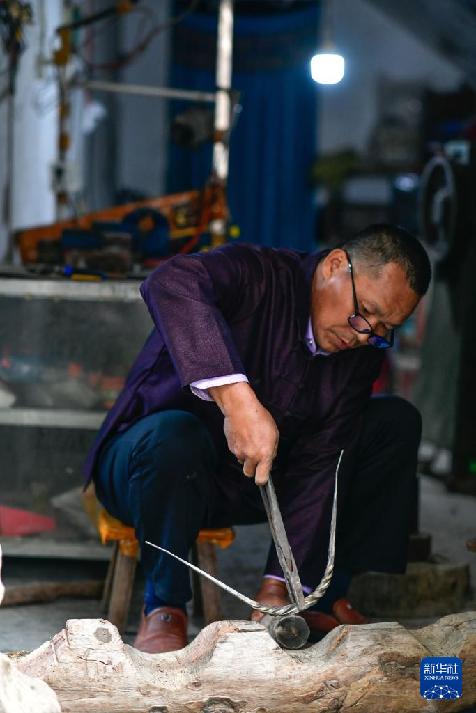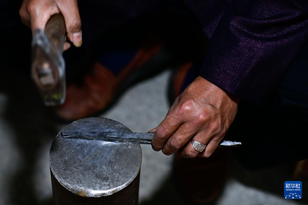 4月21日,贵州省黎平县水口镇的侗族银匠杨光儒在锻造银项圈。新华社记者 杨文斌 摄