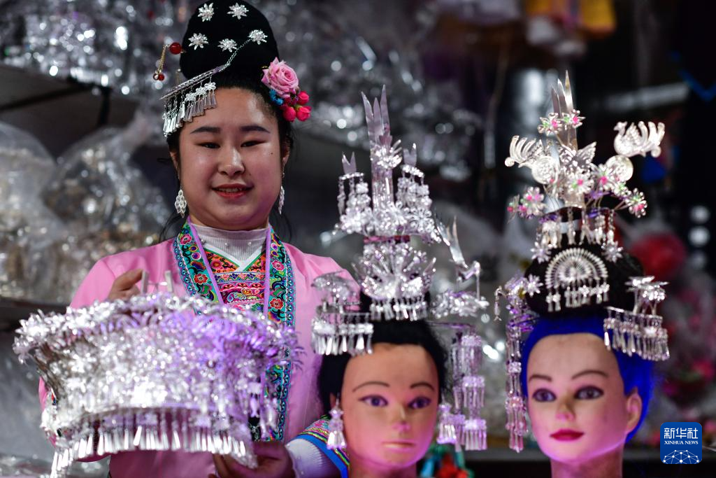 4月21日,贵州省黎平县水口镇的侗族姑娘杨爱鲜在整理自家银饰店里销售的银饰。新华社记者 杨文斌 摄