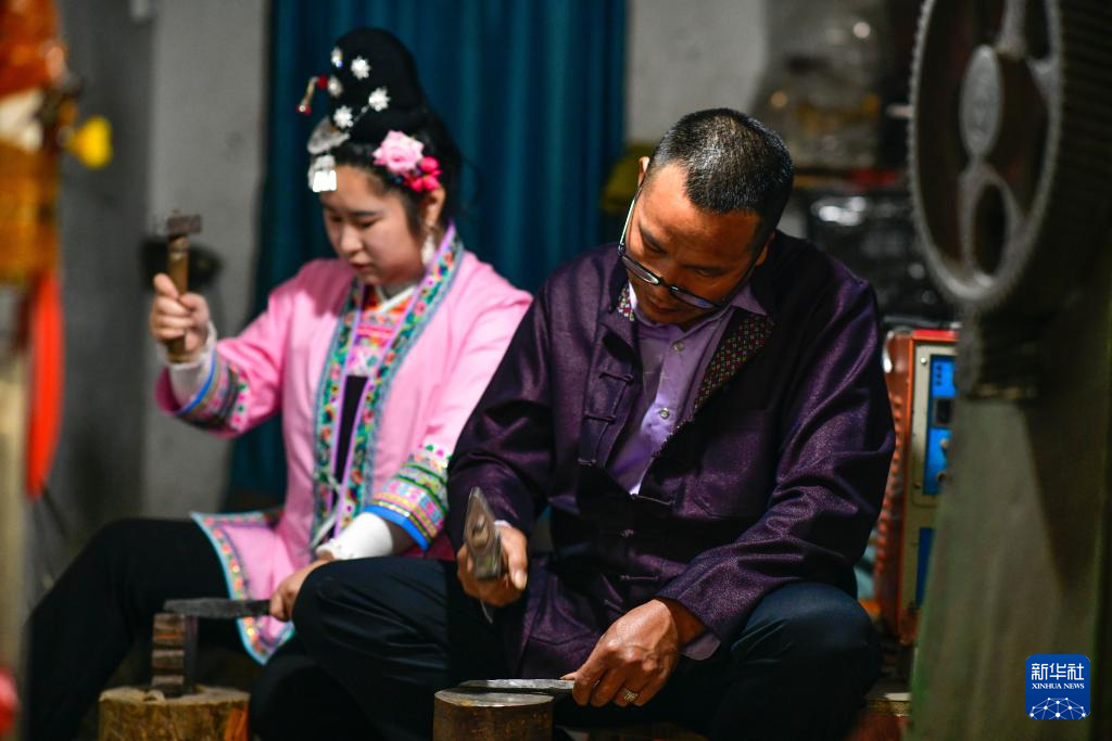 4月21日,贵州省黎平县水口镇的侗族银匠杨光儒(右)与女儿杨爱鲜一起锻造银项圈。新华社记者 杨文斌 摄