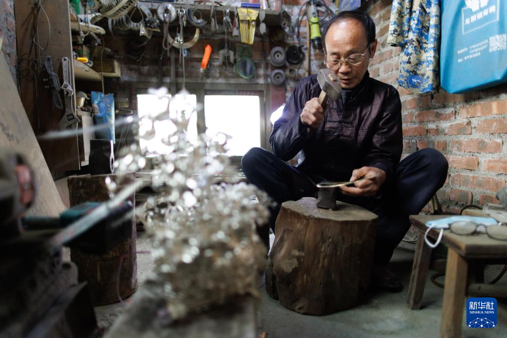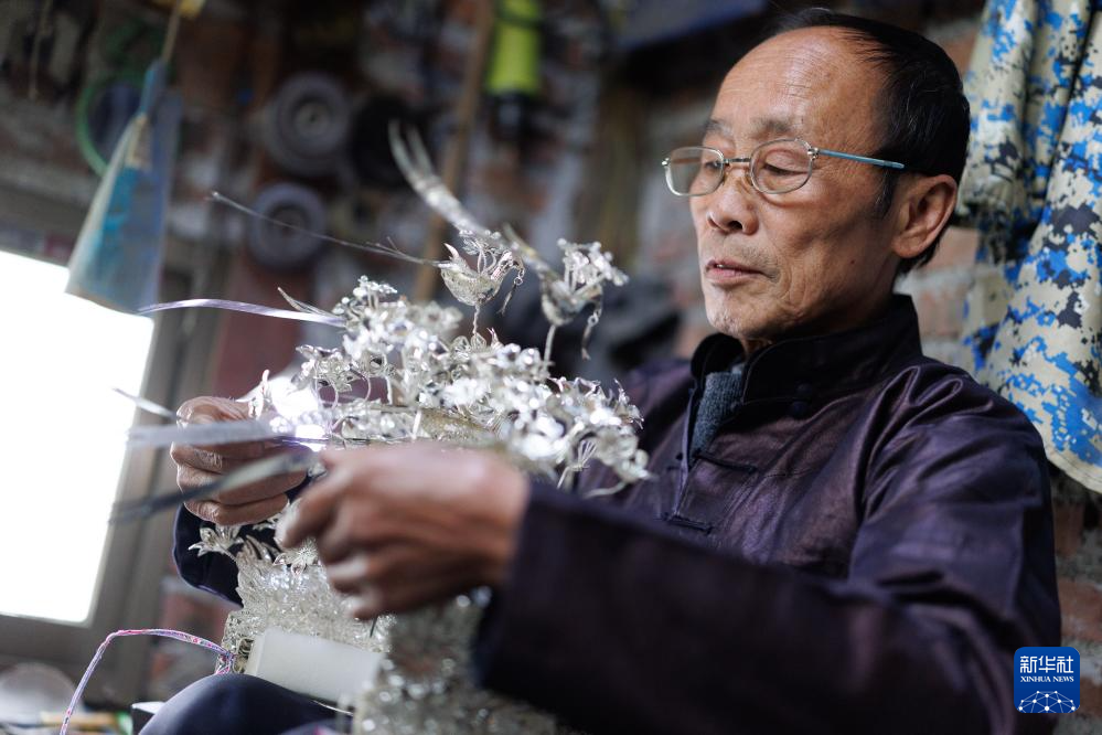 银匠吴仕清在黎平县水口镇纪流村制作银饰(4月21日摄)。新华社记者 刘续 摄