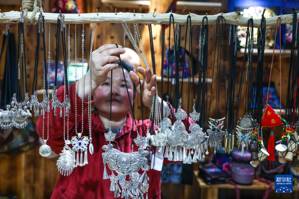 4月21日,贵州省黎平县肇兴侗寨的商户在整理销售的银饰文创产品。新华社记者 杨文斌 摄