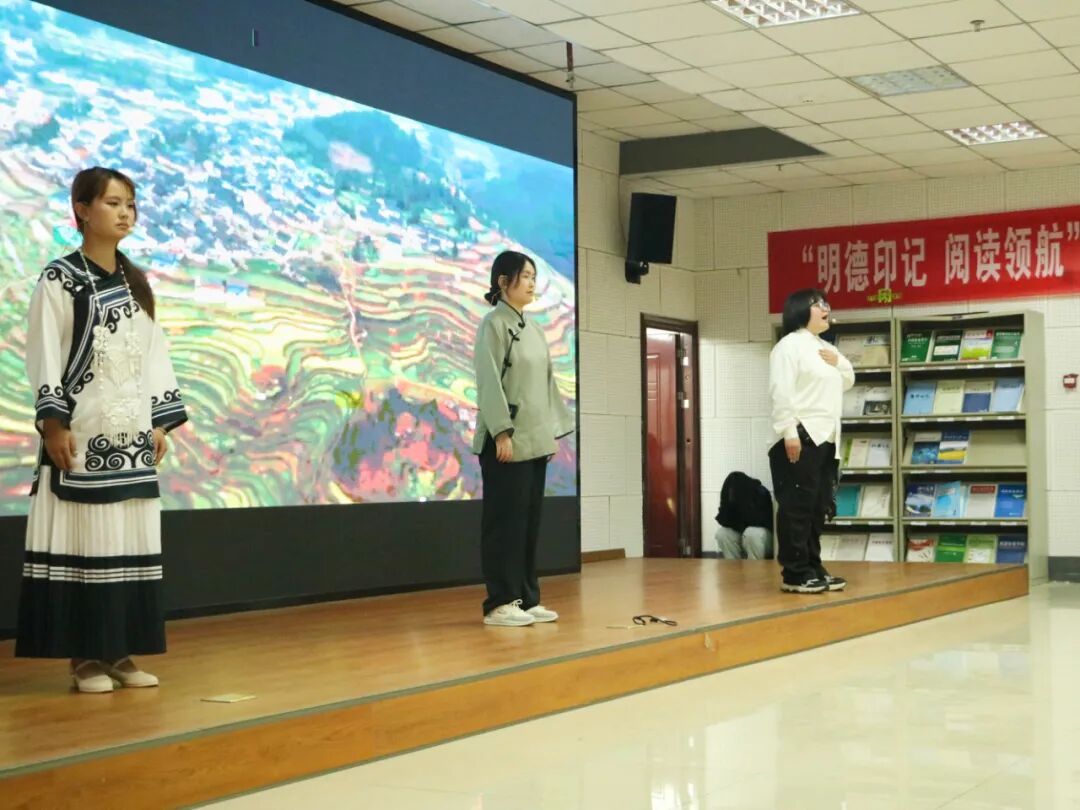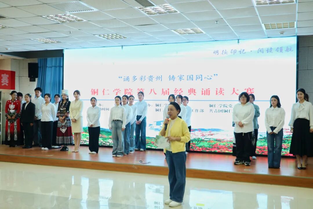 启动仪式后,举行了“诵多彩贵州·铸家国同心”经典诵读比赛。党委宣传部副部长梁光华,党委学生工作部副部长武国丽,文学与传媒学院副教授郭征帆、副教授刘太胜,教育学院副教授王梅担任评委。比赛从《打开贵州这本书》《情在贵州山水间》《多彩贵州·大美山河》《如果说贵州》,到《黔山魂》《青春颂贵州》《黔地巾帼·芳华灼灼》《铭记烽火岁月·礼赞黔地担当》《山水同根·黔心如歌》,来自全校12支队伍,通过精彩演绎生动展现贵州深厚的历史底蕴、多彩的民族风情、独特的自然风貌以及蓬勃的时代气象,以诵读的力量,引导全校师生感受贵州大地的文化温度与民族融合之美,让黔山秀水的文化记忆与时代精神交相辉映,进一步铸牢中华民族共同体意识,凝聚起团结奋进,书香润校园的强大精神合力,为建设书香铜仁,构建全民阅读促进体系,在开创百姓富、生态美的多彩贵州新未来中展现铜仁学院的责任与担当。