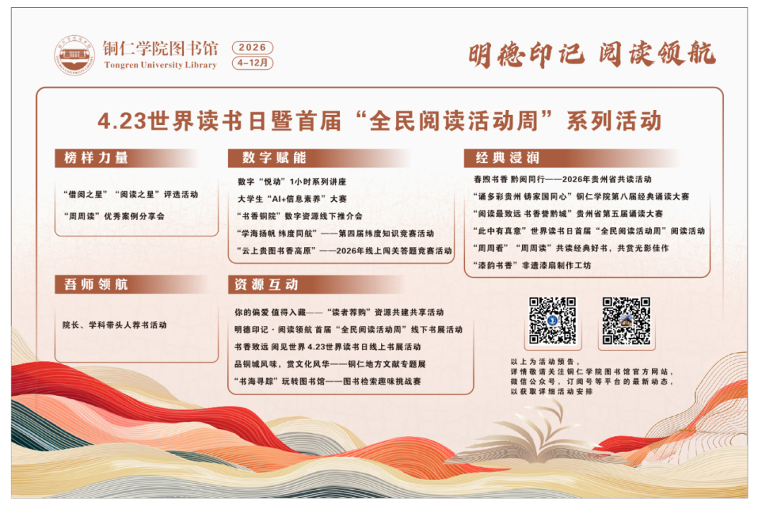 据悉,图书馆内还设置了“你的偏爱 值得入藏——读者荐购”资源共建共享专区,开通线上线下荐购渠道,广泛征集读者阅读诉求;“明德印记·阅读领航”线下实体书展,专柜展出馆藏茅盾文学奖、文津图书奖获奖书籍;“书香致远 阅见世界”——4.23世界读书日线上书展,读者线上扫码阅读,满足读者多元化阅读需求;“品铜城风味,赏文化风华”——铜仁地方文献专题展,让读者在字里行间读懂铜仁,在唇齿之间品味家乡。还组织开展“书香铜院”数字资源线下推介会及数字“悦动”1小时系列专题讲座,“此中有真意”全校线上共读活动,“春煦书香 黔阅同行”全省共读活动,以及各类打卡互动活动,以不同的方式吸引读者放下指尖浮躁,暂别喧嚣纷扰。走进图书馆,与先贤对话、与智者同行,在墨香中感受文字之美,在品读中体悟人生真谛,让阅读成为校园里最动人的风景,成为青春里最珍贵的习惯。