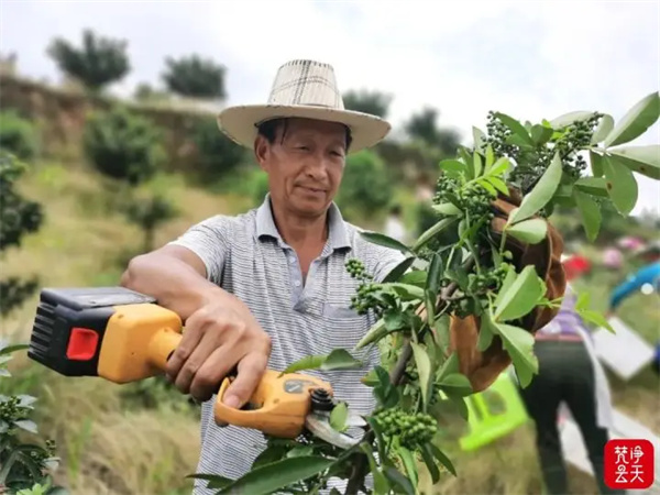 在思南,这段时间也正是花椒采收的高峰期。大坝场镇场坝社区的花椒种植基地里,郁郁葱葱的花椒树长满了整个山头,椒农们戴着手套、手握剪刀采摘花椒,浓浓的椒香里弥漫着丰收的喜悦。