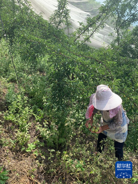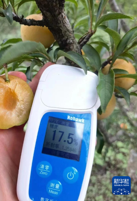 6月17日,林家有李种植养殖专业合作社工作人员在采摘蜂糖李之前测量糖度。新华社记者齐健 摄