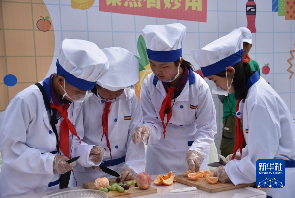 6月9日,在云岩区劳动教育实践技能竞赛上,参赛队伍在制作水果拼盘。新华社记者 骆飞 摄