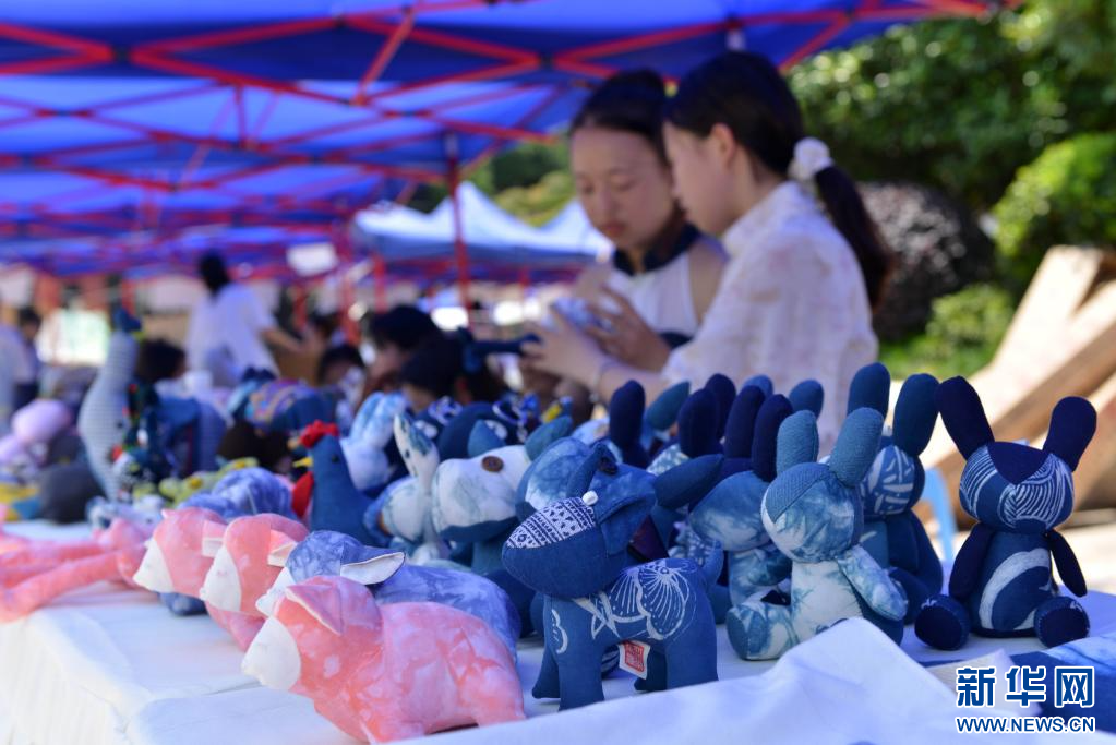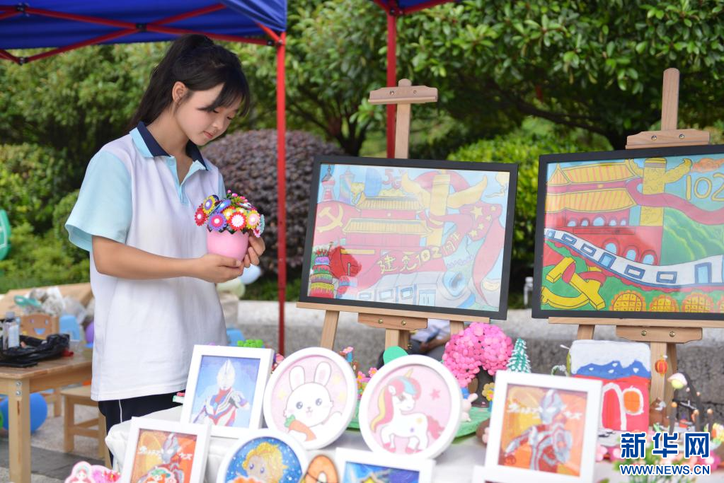 7月1日,贵州省龙里县中等职业学校的学生展示民族文化布艺工艺品。新华网发(冯涛 摄)