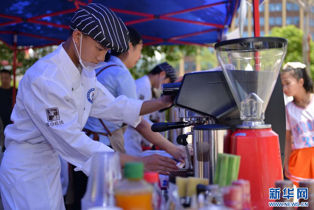 7月1日,贵州省龙里县中等职业学校的学生在进行制作咖啡技能展示。新华网发(冯涛 摄)