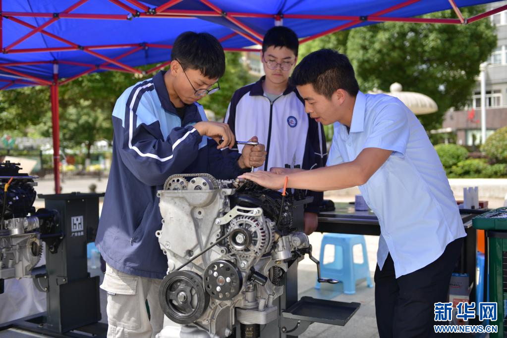 7月1日,贵州省龙里县中等职业学校的师生在进行汽车零部件维修技能展示。新华网发(冯涛 摄)