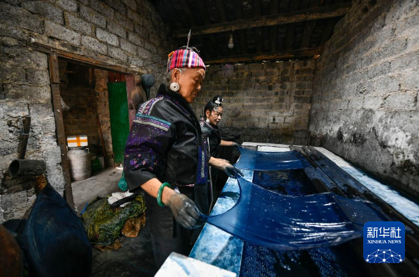 潘玉珍(前)与女儿张艳梅在染布。新华社记者 杨文斌 摄