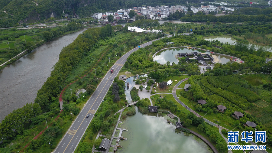 梵净山下江口县一处依河而建的观景健身步道(无人机照片,7月5日摄)。新华网 黄勇摄