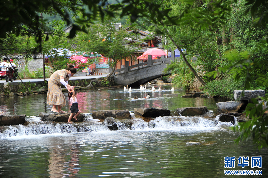 7月5日,两名小孩在梵净山下江口县的一处村落的河中嬉水。新华网 黄勇摄