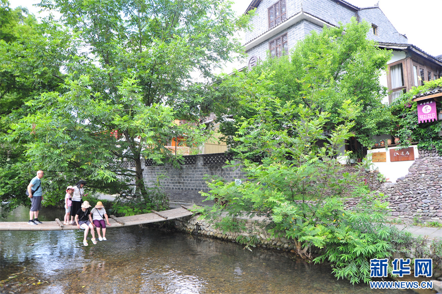 梵净山下江口县一处村落,游客在村中河边游玩(无人机照片,7月5日摄)。新华网 黄勇摄