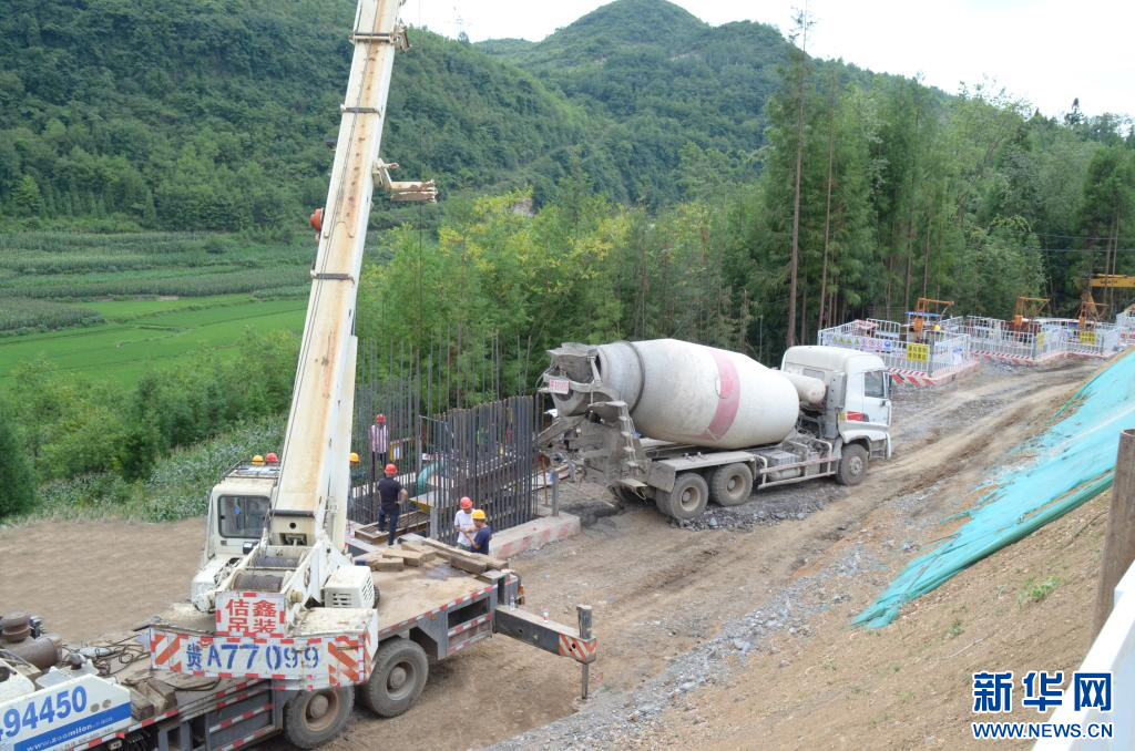 7月7日,中铁五局工作人员正在进行混凝土浇筑。新华网发(任梅摄)