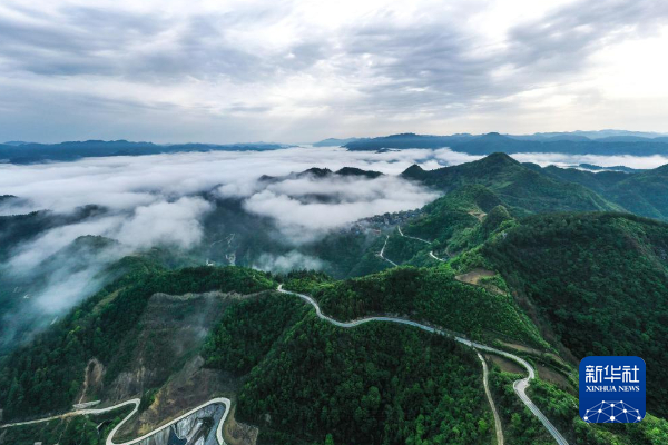 这是2023年4月26日在贵州省剑河县革东镇拍摄的苗寨云海景观(无人机照片)。新华社记者 杨文斌 摄