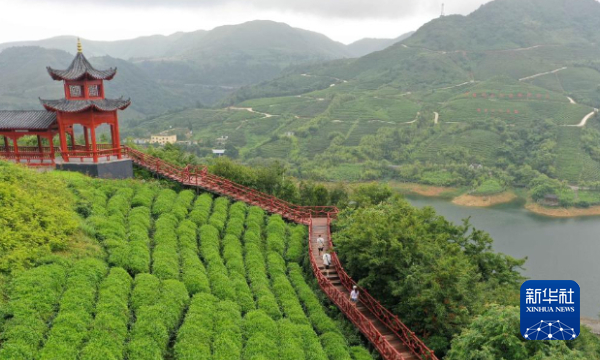 7月1日,游客在贵州都匀市毛尖镇坪阳村茶山游玩(无人机照片)。新华社发(肖伟摄)