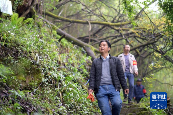 2021年4月16日,护林员在纳雍县张家湾镇补作村珙桐花开的山林里巡查。新华社记者 杨楹 摄