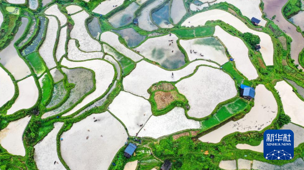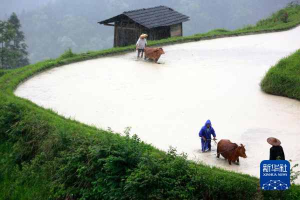 5月23日,贵州省黔东南苗族侗族自治州黎平县尚重镇上洋、下洋、岑埂等村的农民来到岑丈梯田,参加“千牛同耕”活动。 新华社发(方鹏 摄)