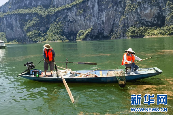 贵州省黔西市新仁苗族乡化屋村村民杨清鑫(左)和妻子一起打捞乌江水面垃圾(7月6日摄)。新华社记者吴箫剑 摄